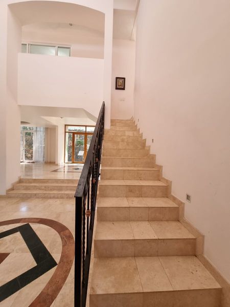 P.B.: Estancia sala-comedor con piso de mármol travertino, con amplios ventanales con vista al jardín interior, terraza, amplia cocina integral con barra de granito, alacena y desayunador, estudio con vista al jardín, baño de visitas, cuarto de lavado, cuarto de servicio con baño, área de tendido, bodega.