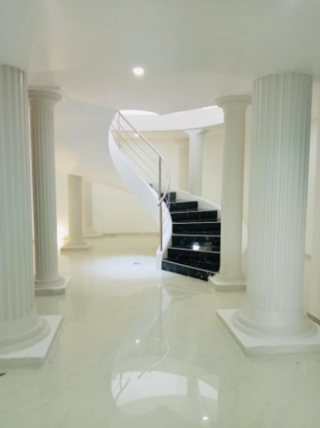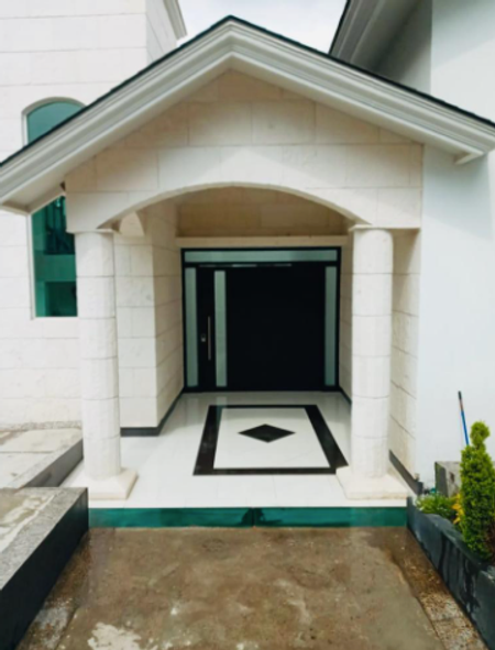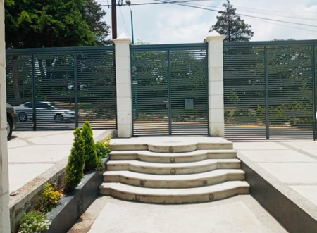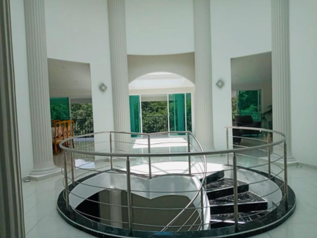 Cámaras de vigilancia justo frente a la casa, entrada de excelente luz natural, pilares estilo griegas, pisos de mármol, espacios amplios. Caída de agua en uno de los laterales de la casa, muros de cantera.