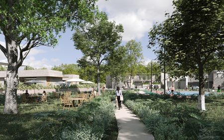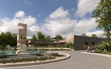 Glorieta/rotonda principal con monumento sobre espejo de agua en la entrada.