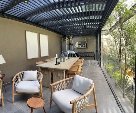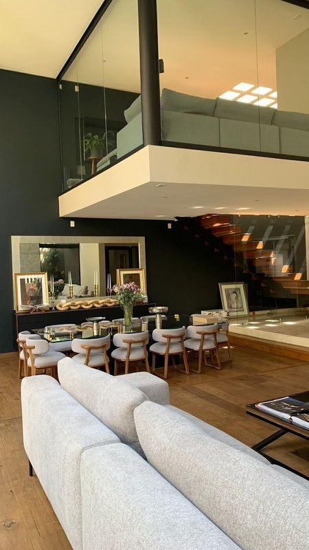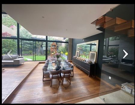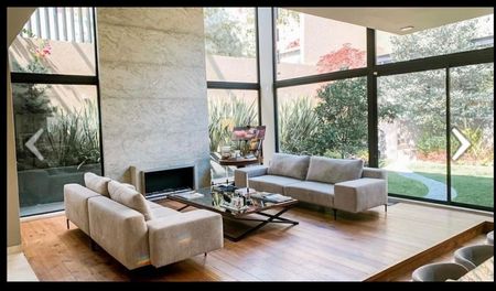 Sala muy amplia con vista al jardín por medio de ventanales de cristal de techo a piso
