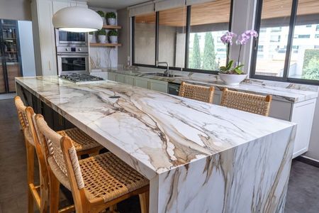 Cocina de gran tamaño con isla integrando estufa y ante comedor con área de despensa y área de refrigerador Sub Zero.