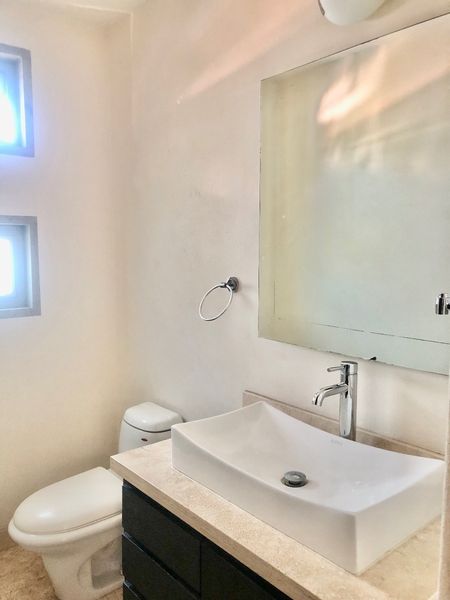 Medio nivel abajo, hermosa area social con barra de bar , salida a jardin aprox 80 mts , medio baño de visitas , ( acceso por garage tambien ) lo que hace de esta area aun mas funcional y comoda