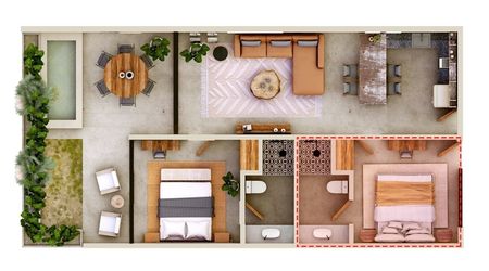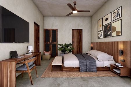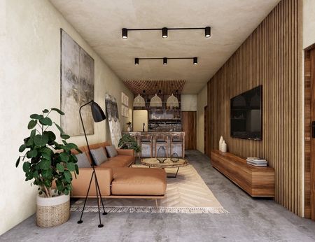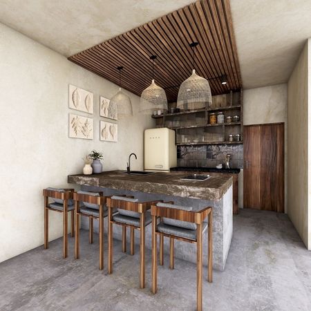 Estos hermosos nuevos departamentos de 2 y 3 habitaciones ofrecen diferentes distribuciones y opciones para satisfacer tus necesidades, incluyendo opciones de división para una ocupación adicional y potencial de ingresos. Están diseñados en un estilo contemporáneo y cuentan con una decoración ecléctica que incluye mosaicos de Yucatán, azulejos de Talavera en la cocina y el baño, y madera Tzalam que protege contra el calor. Tienen una cocina con isla y una sala de estar llena de luz que se abre a una terraza privada con alberca. Estos departamentos tienen pisos de concreto pulido, paredes y techos de chukum, y armarios en las habitaciones. Se ofrecen en venta sin amueblar, pero equipados con ventiladores de techo, aire acondicionado y algunos electrodomésticos.