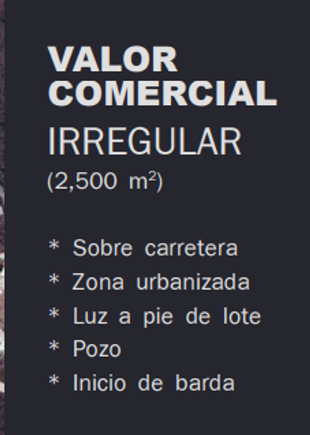 TERRENO EN VENTA SOBRE CARRETERA, LUZ A PIE DE LOTE, TERRENO IRREGULAR, POZO, INICIO DE BARDA