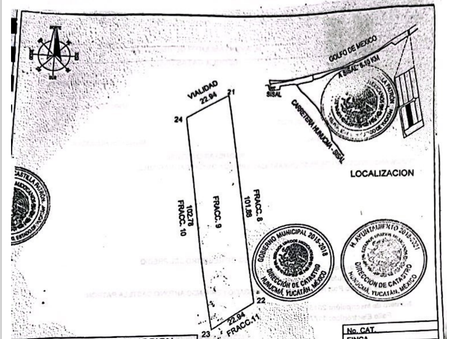 El terreno se ubica en el complejo Privada Sisal, a 6 km aproximadamente del pueblo, zona exclusiva residencial con 16 lotes, el lote en venta es el numero 9 en 2da fila y mide 23 metros de frente y 102 metros de fondo (ligeramente irregular), cuenta con luz, calle blanca y mojoneras.