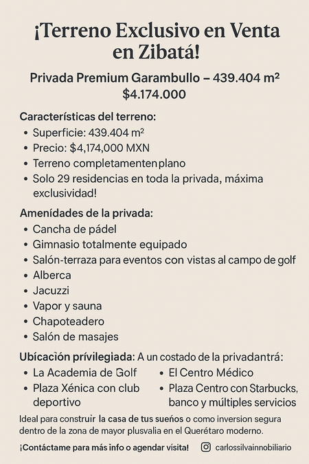 Descubre esta increíble oportunidad de inversión en una de las privadas más exclusivas de Zibatá: Garambullo Premium, con colindancia directa a áreas verdes y al campo de golf.