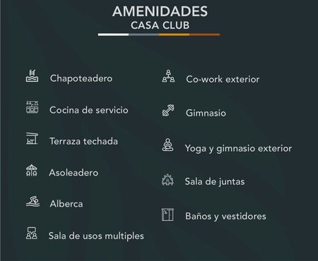 Amenidades: juegos de escalar, pet parkub, cancha de futbol, jogging, estacionamiento, cancha de padel y de tenis, parques al aire libre, Casa Club con: alberca, asadores, sala de uso multiple, gimnasio, cocina d eservicio, Co-work exterior, sala de juntas, entre otros.
