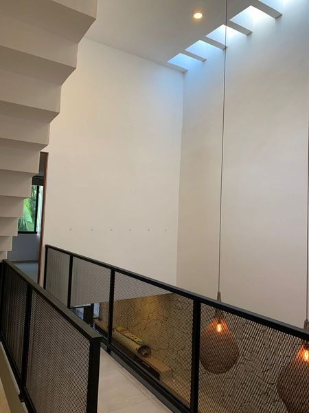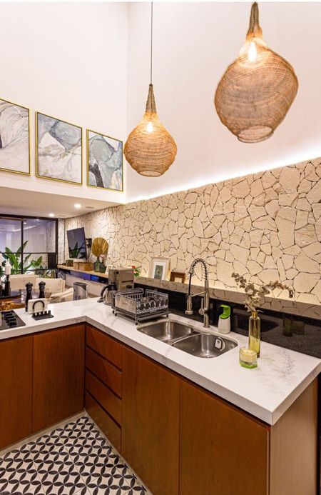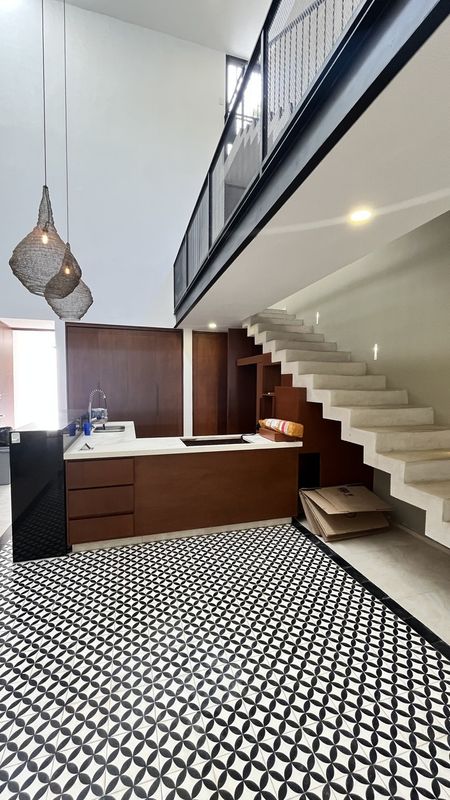 - Cocina con gavetas inferiores y superiores, con meseta de granito y barra desayunadora