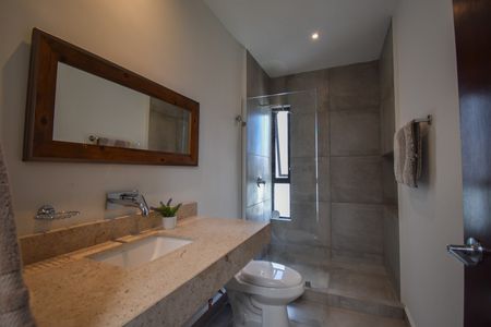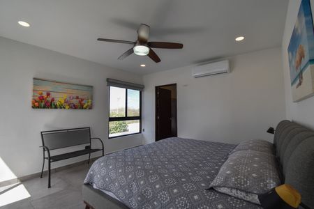 - Recámara secundaria 1 (frente a escaleras): cama, closet de pared, sillón, mesa de noche, persianas, mosquiteros, ventilador, aire acondicionado, baño completo con cancel, accesorios y espejo.