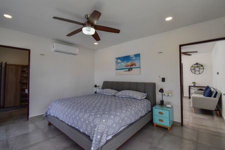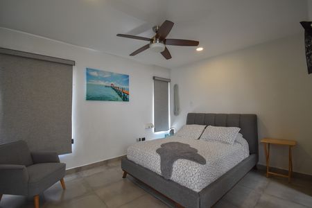 - Recámara secundaria 2: cama, sillón, mesa de noche, persianas, mosquiteros, ventilador, aire acondicionado, espacio de closet vestidor con closet movible, baño con cancel y accesorios.