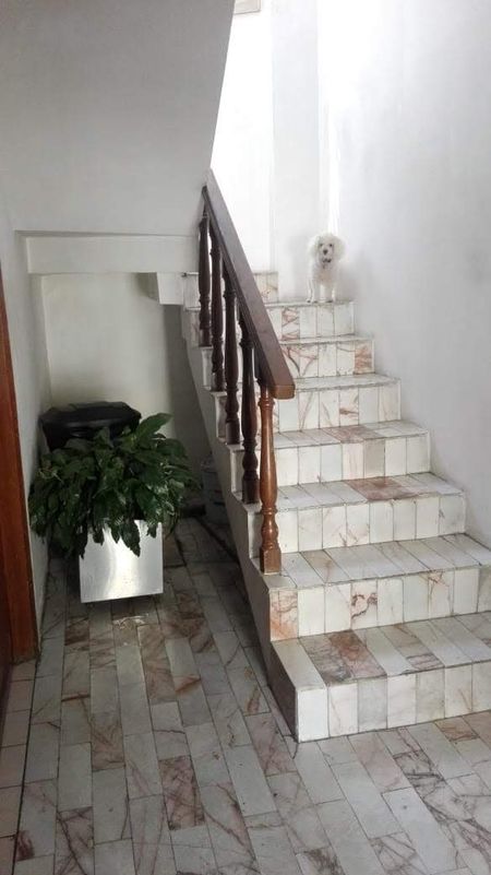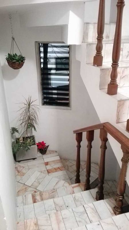 Escaleras con piso de mármol color rosa, loseta, paredes con aplanado, techos de tirol.