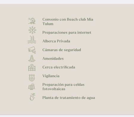 El proyecto cuenta con 12 departamentos y 6 penthouse, todos con alberca privada, los cuales tienen cerca electrificada, vigilancia, preparación de celdas fotovoltaicas, áreas verdes, planta de tratamiento de agua y rooftop; además cuenta con Club de playa.