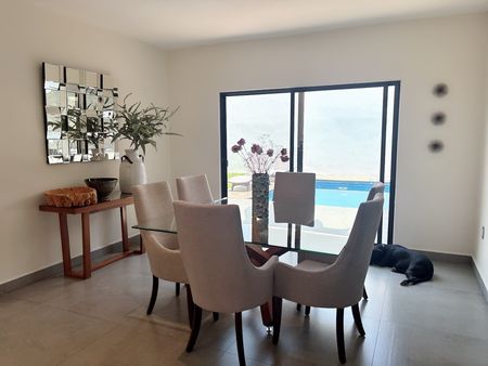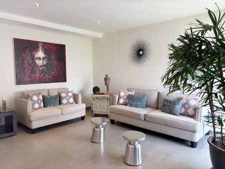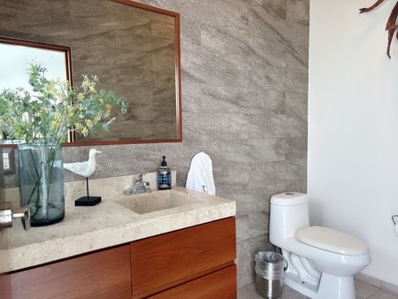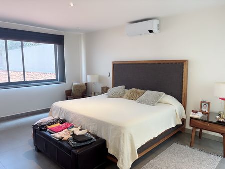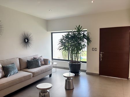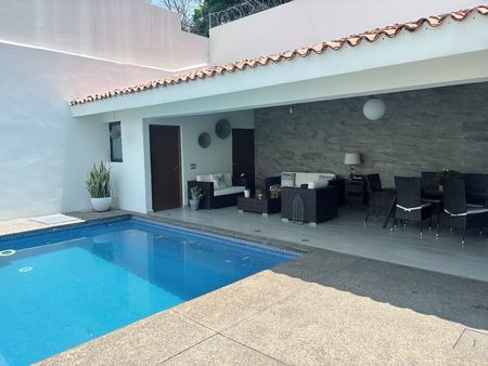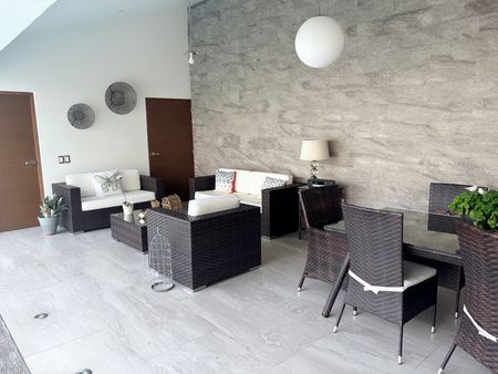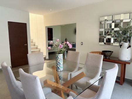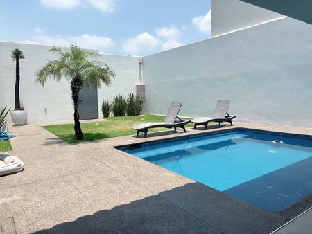 Casa 3 recamaras con baño completo, sala - comedor, cocina equipada con salida a terraza, barra desayunador de granito, sala de juegos, sala T.V. family room, terraza con medio baño y bodega, jardín 50 mts con riego por aspersión, alberca.