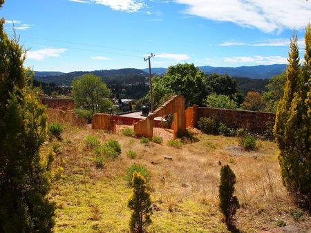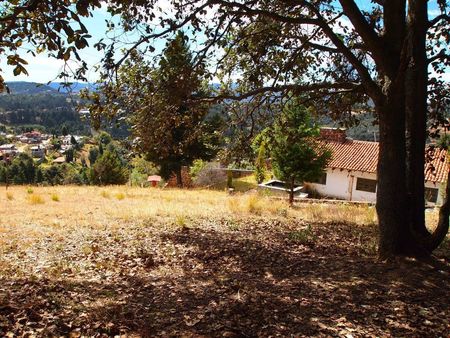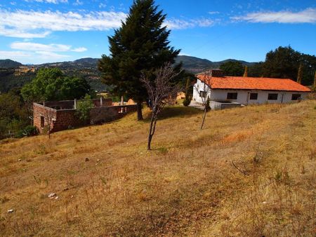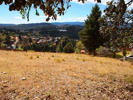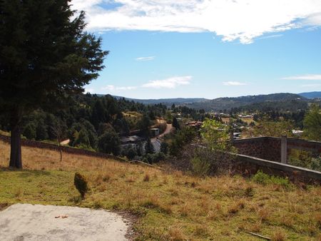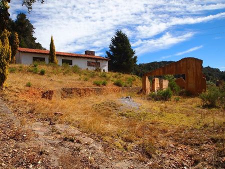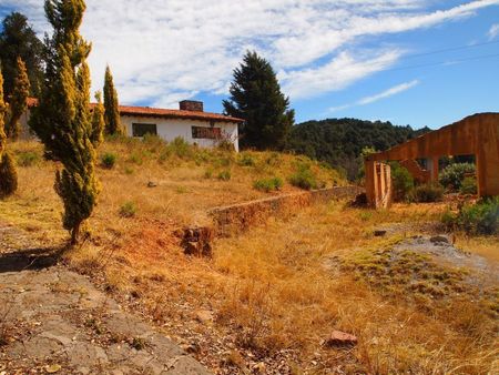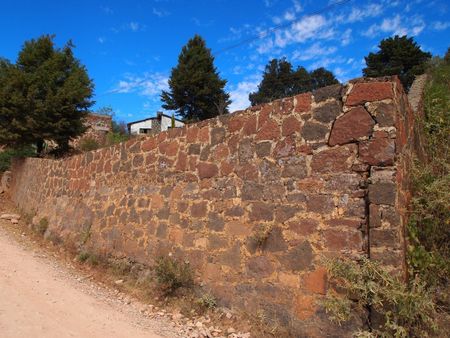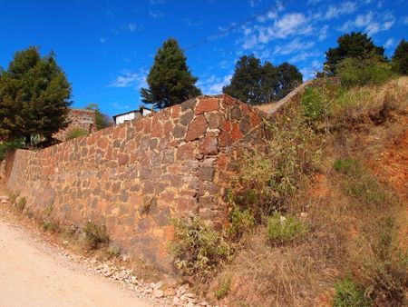 Terreno rústico triangular ascendente ligero con construcción de barda perimetral de cantera, construcción 120 mts, con 3 recamaras, un baño, cocina, sala-comedor con chimenea, muros para bodega o salón.