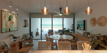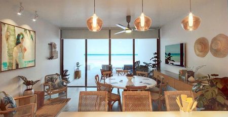 Exclusivo desarrollo FRENTE AL MAR de 4 villas, ubicado en el km 22.5 de la carretera Uaymitún - Telchac Puerto. Planta baja: 98.48 m Primer nivel: 88.34 m Segundo nivel: 55.07 m Construcción Total: 241.89 m2 Terreno: 200m2 (Frente: 5m x Fondo: 40) VILLAS: 4 unidades de tres recámaras Cada villa está compuesta: Planta Baja: Cochera para 4 automóviles, Recibidor, Medio baño, Cocina con alacena, Comedor, Terraza FRENTE AL MAR con pequeña alberca, Cuarto de servicio con baño completo, Patio de servicio y lavadero, Escaleras. Primera Planta: Recamara principal con baño completo, walk-in closet y terraza Recámara secundaria con baño completo y walk in closet Escaleras. Segunda Planta: Recámara secundaria con baño completo y walk in closet Bar y terraza en roff top. Incluye: Mesetas de granito en cocina y bar Meseta de mármol en baños y espejos No se incluyen en carpintería de closet. Se construirá meseta de concreto con repisas y tubo de aluminio para colgar ropa. Calentador eléctrico de 60 litros de 220 volts. Se entrega salida de alimentación para aires acondicionados tipo “Mini Split” Villas con cisternas individuales para cada unidad con capacidad de 10,000 litros. No existe servicio de agua potable en la zona. DISEÑO Y UBICACIÒN INMEJORABLES *Precio y disponibilidad sujetos a cambio sin previo aviso*